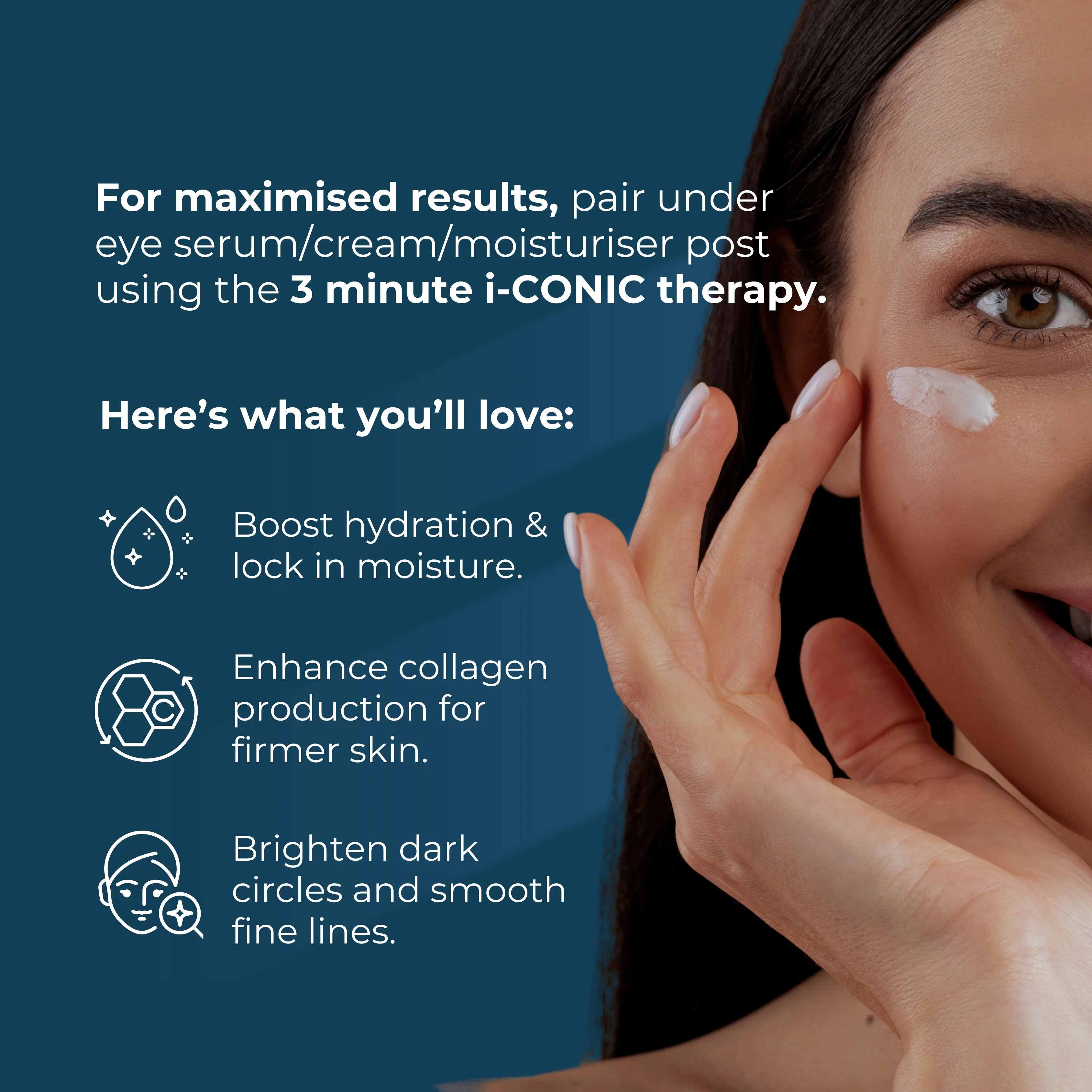 The eye area is the first place where fatigue and aging show up — fine lines, puffiness, dark circles. With i-CONIC, we wanted to bring the same science trusted in dermatology clinics, but in a form you can use safely at home. It’s not just another eye tool — it’s designed for Indian skin, and crafted to give you results in minutes. Every session is your daily reset: calm, youthful, radiant eyes.